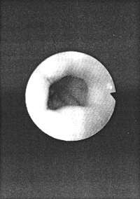 As the contraction causes the lumen to "disappear", the event itself (except for the contraction of the left loop) is not visible gastroscopically. In this sense maximal contraction of the pyloric sphincteric cylinder causes, gastroscopically speaking, an event horizon in the distal stomach. After a few seconds the sphincteric cylinder (including its left loop) relaxes, revealing the pyloric aperture, which is seen to be open (Fig. 14.3).