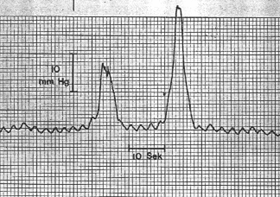 Fig. 15.1. Two Type II pressure waves of pyloric sphincteric cylinder. Simultaneous radiography showed typical contraction of cylinder during both waves. Base line indicates intraluminal pressure in absence of radiologically visible motor activity. 10- second marker on zero line - In two of the subjects compound waves, consisting of a rise in base line pressure of 3 to 5 mm Hg and lasting for 10 to 40 seconds, on which were superimposed waves of shorter duration (3 to 5 seconds) and higher amplitude (up to 12 mm Hg) were seen. These conformed to Type III waves (Shepard l97l). (Comment: Radiologically both types of waves were associated with typical contractions of the pyloric sphincteric cylinder. Compound waves are usually ascribed to additional increases in tone. Contractions of the cylinder in the full stomach are usually quite regular, tending to occur at a rate of 3 per minute. The fact that pressure waves occurred irregularly in this investigation, might have been due to the fact that a small volume of liquid barium was used. Houghton et al pointed out that emptying of solids was associated with an increase in frequency of "antral" peristaltic waves; vide infra).