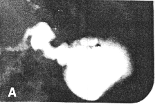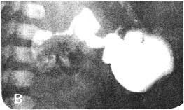 | Fig. 20.1. A Case J.B. Erect position. Long, atonic stomach, the sagging greater curvature forming most dependent part. Absence of peristalsis, cyclical activity of sphincteric cylinder and emptying of fluid barium. B Case J.B. Oblique tilted position. Normal pyloric ring and patent aperture. Immediate emptying of fluid barium in continued absence of peristalsis and cyclical activity of sphincteric cylinder | |