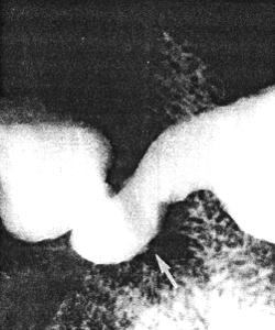 | Fig. 20.6. Case W.J.G. Contracted pyloric sphincteric cylinder with prominent mucosal fold (arrow). Gastroscopy showed no organic lesion |