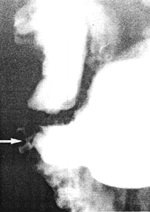 Fig. 21.1. Case D.J. Small, branching, diverticulum-like structure (arrow) on greater curvature side of pyloric sphincteric cylinder |