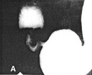 | Fig. 28.4. A Case C.C. Marked contraction of sphincteric cylinder, with longitudinal mucosal folds B Case C.C. Some relaxation of cylinder. A mucosal fold has changed in direction to become circular. Cyclical activity absent | B |