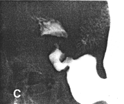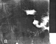 Case 28.4 C.C., 36 year old female. Radiographic examination showed the pyloric sphincteric cylinder to be markedly contracted most of the time; at such times it contained longitudinal mucosal folds (Fig. 28.4A). Occasionally it relaxed to a certain extent, when a fold changed in direction to become circular (Fig. 28.4B); relaxation was never complete and cyclical activity was absent. Endoscopy revealed an erosion on the lesser curvature side of the pyloric region; touching the mucosa caused haemorrhage. The endoscopic diagnosis was erosive antral gastritis.
