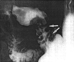 | Fig. 28.3. Case L.M. Constant contraction of sphincteric cylinder (arrows), with prominent irregular, static mucosal folds |