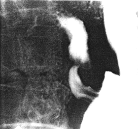 | Fig. 28.5. Case J.M. Partial contraction of sphincteric cylinder, with absent cyclical activity. Prominent static, circular mucosal fold in cylinder (arrow) |