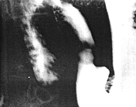 Case 28.1. G.G., 52 year old male. Radiographic examination showed a moderate degree of constant contraction of the pyloric sphincteric cylinder, with absence of normal, cyclical contraction and relaxation; the contraction fixed the pyloric aperture in the open position (Fig. 28.1). The stomach appeared to be hypertonic; rapid emptying of fluid barium occurred. Endoscopic biopsy of the "antral" region revealed acute on chronic gastritis; no evidence of malignancy was seen. Repeat endoscopic biopsy two months later showed acute on chronic inflammatory reaction in the lamina propria, with eosinophylic infiltration and without evidence of intestinal metaplasia. Stainings for Helicobacter pylori were positive. A third endoscopic biopsy two months after the second, showed chronic gastritis with intestinal metaplasia. Stainings for Helicobacter pylori were negative.