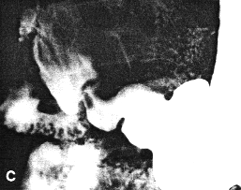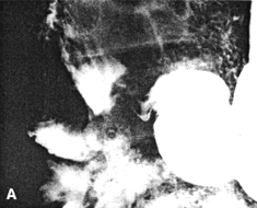 Case 29.2 I.H., 59 year old male, presented with longstanding epigastric pain and malaena. Radiographic examination showed a large ulcer in the posterior wall of the midcorpus. Endoscopic biopsy confirmed the ulcer; the gastric mucosa showed intestinal metaplasia with prominent acute and chronic inflammatory cells, diagnosed as subacute gastritis. No evidence of malignancy was found. After anti-ulcer therapy the patient was temporarily lost to follow-up, but reappeared three years later. Radiographic examination showed the following: after the first two mouthfuls of barium a large ulcer on the posterior wall of the corpus was evident as before (Fig. 29.2A). Before barium entered the duodenum a constant, deep spastic incisura was seen in the pyloric region of the distal greater curvature; swallowing more barium showed it to be due to contraction of the left pyloric loop (Fig. 29.2B). The pyloric sphincteric cylinder between the left loop and the pyloric aperture remained partially contracted, normal cyclical contraction and relaxation being absent. The pyloric aperture remained patent and emptying of fluid barium appeared normal; the appearances were unchanged throughout the examination.