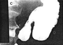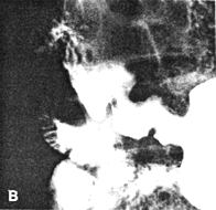 Case 29.3 V.D., 30 year old male, complained of epigastric pain not responding to antacids. Radiographic examination showed a gastric ulcer 1.5cm in diameter, on the lesser curvature at the angulus (Fig. 29.3A); no signs of malignancy were seen. Intially there was marked contraction of the pyloric sphincteric cylinder, which contained a few prominent mucosal folds; this was associated with delay in emptying of liquid barium. After barium had filled the cylinder, it was seen to remain contracted throughout the examination; although a minor degree of relaxation occurred occasionally, the apperances remained as illustrated most of the time, with absence of cyclical activity (Fig. 29.3B). Longitudinal mucosal folds were evident in the contracted cylinder. Endoscopic biopsy showed a benign looking gastric ulcer in the corpus. Microscopically there was mixed inflammatory cell infiltration, diagnosed as acute on chronic gastritis. No evidence of malignancy was seen. Repeat endoscopy 2 months later showed that the ulcer had healed.