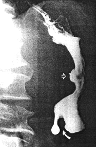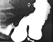 | Fig. 29.8. Case L.J. Constant contraction of pyloric sphincteric cylinder (filled arrows). Ulcer in contracted cylinder (open arrow) |