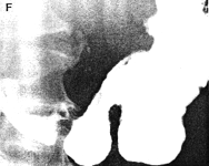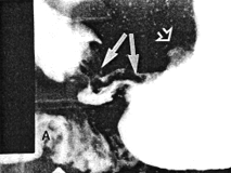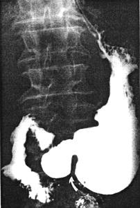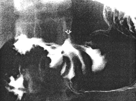 | Fig. 29.7. Case A.J. Ulcer (arrow) in sphincteric cylinder, which is deformed. Absent cyclical activity. Prominent, unchanging, oblique mucosal folds drawn in towards ulcer |
