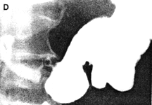 | Fig. 29.4 A-D Case F.F. Malignant ulcer at incisura angularis (open arrow). Constant contraction of pyloric sphincteric cylinder with absent cyclical activity (filled arrows) | |