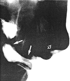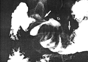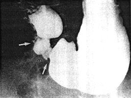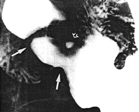 | Fig. 29.6. Case M.T. Ulcer (open arrow) in sphincteric cylinder, which is deformed and permanently contracted (filled arrows). Circular, unchanging mucosal folds drawn in towards ulcer |