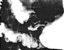 | Fig. 29.3. A Case V.D. Gastric ulcer on lesser curvature at angulus (open arrow). Marked contraction of sphincteric cylinder (filled arrow). B Case V.D. Gastric ulcer at angulus (open arrow). Constant contraction of sphincteric cylinder (filled arrows) with absent cyclical activity. | B |