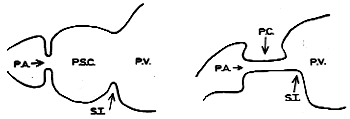 | Fig. 3.1. A. Divisions of pyloric region according to Cunningham. P.S.C., pyloric sphincteric cylinder; P.V., pyloric vestibule; P.A., pyloric aperture; S.I., sulcus intermedius. B Contracted pyloric sphincteric cylinder according to Cunningham. P.C., pyloric canal; P.V., pyloric vestibule; P.A., pyloric aperture; S.I., sulcus intermedius |