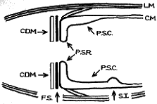 | Fig. 3.2. Diagram of pyloric musculature according to Cunningham. P.S.C., pyloric sphincteric cylinder; P.S.R., pyloric sphincteric ring; F.S., fibrous septum; C.D.M., circular duodenal musculature; L.M., longitudinal musculature; C.M., circular gastric musculature; S.I., sulcus intermedius |