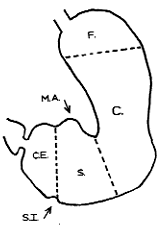 | Fig. 3.3. Muscular regions of stomach according to Forssell, F, fornix; C, corpus; S, sinus; C.E., canalis egestorius; M.A., membrana angularis; S.I., sulcus intermedius |