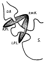 | Fig. 3.5. Diagram of circular musculature of sphincteric cylinder (canalis egestorius) according to Torgersen. R.P.L., right pyloric (canalis) loop; L.P.L., left pyloric (canalis) loop; P.M.K., pyloric muscle knot (torus); S, stomach; D.B., duodenal bulb. (Ring of circular musculature surrounding commencement of duodenum not shown.) |