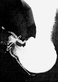 | Fig. 3.6. Radiograph of morbid anatomical specimen. Barium fills the lumen and outlines the serosa of the lesser and greater curvatures. A short tube of thickened muscularis externa extends orally from the pyloric ring |