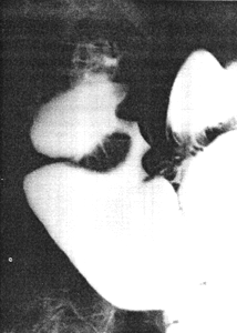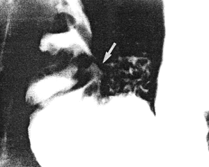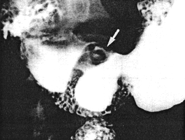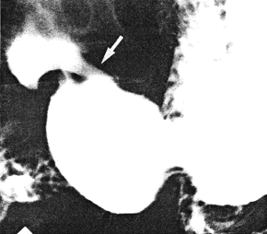 | Fig. 31.2. Case J.N. Fistula between pyloric sphincteric cylinder and base of duodenal bulb on lesser curvature side (arrow). Constant contraction of sphincteric cylinder. Pyloric aperture patent |