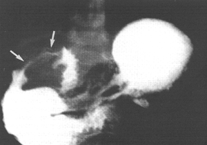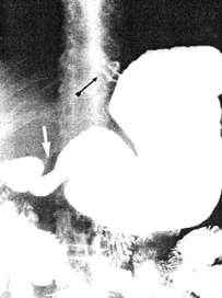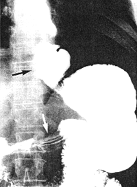 | Fig. 32.2 A,B. Case A.G.C. Large, sliding hiatus hernia (black arrows). Contracted pyloric sphincteric cylinder (white arrows) | |