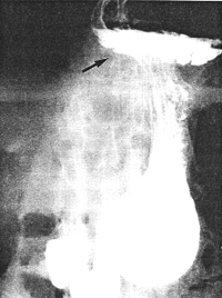 | Fig. 32.3. Case F.V. Large irreducible hiatus hernia (black arrow). Contracted pyloric sphincteric cylinder |