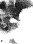 | Fig. 32.4 A. Case C.W. Sliding hiatus hernia with free gastro-oesophageal reflux (arrow). B. Case C.W. Constant contraction of pyloric sphincteric cylinder. Pyloric aperture "fixed" in open position | |