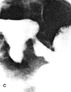 Case 32.4. C.W., 70 year old female, was a known case of hiatus hernia and peptic oesophagitis. Radiographic examination showed irregular narrowing of the distal oesophagus, a sliding hiatus hernia and free gastro-oesophageal reflux (Fig. 32.4A). There was constant contraction of the pyloric sphincteric cylinder, with absence of cyclical activity; the partially contracted cylinder fixed the pyloric aperture in the open position (Fig. 32.4B). Intramuscular administration of an antispasmodic produced no change. Endoscopy confirmed the hiatus hernia with chronic, non-specific oesophagitis. No structural abnormality was seen in the remainder of the stomach, the pyloric region and duodenum.