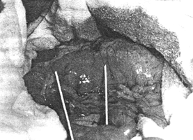 | Fig. 32.7. A Pyloroduodenal junction in the dog. The area in the pyloric region which will undergo contraction is demarcated by the limbs of the forceps (retouched) and is 3.0 cm in length. |