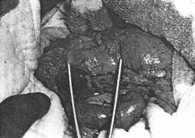 | Fig. 32.7. B Following stimulation of the vagus in the hiatus, the pyloric sphincteric cylinder, demarcated by the forceps, becomes firmly contracted, rubbery hard and anaemic |