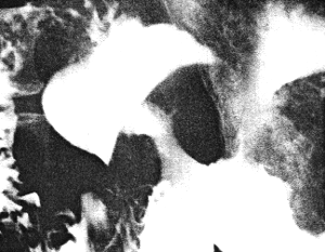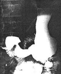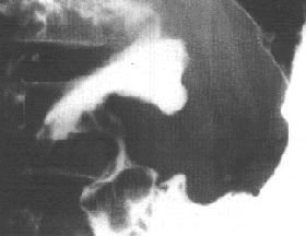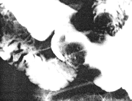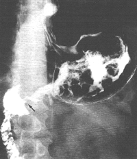 | Fig. 33.4.Case A.S. Irregular filling defect distal stomach. Mucosal folds and cyclical activity of cylinder absent. Pyloric aperture unrecognizable. Concave indentation and irregularity of duodenal bulb. |