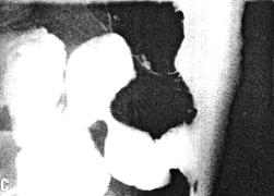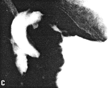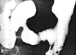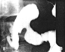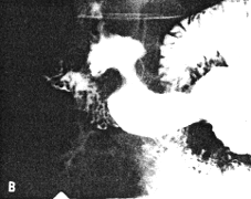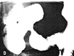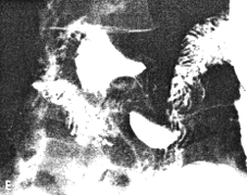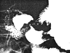 | Fig. 33.7 B-E. Case M.B. Filling defect in narrowed region. Mucosal folds absent. Some movement evident but cyclical contraction and relaxation of sphincteric cylinder absent. Base of duodenal bulb appears normal. | |