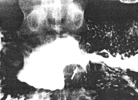 | Fig. 33.9. Case A.F. Small mass lesion at pyloric aperture (arrow). Base of gas-filled duodenal bulb normal. |