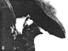 | Fig. 33.8 A-D. Case J.P. Constricting pyloric filling defect. Smooth, concave indentation base of duodenal bulb. | |