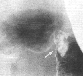 | Fig. 33.3.Case C.J. Irregular, constricting filling defect distal stomach. Mucosal folds and cyclical activity of sphincteric cylinder absent. Duondenal tail (arrow) normal. Concave indentations base of bulb on either side of pyloric aperture. |