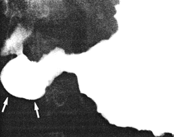 | Fig. 34.2 Case J.J. Irregularity lower lesser curvature with ulcer-like projection. Pyloric sphincteric cylinder expanded. Pyloric aperture patent (arrow). Large, lobulated filling defect in duodenal bulb |