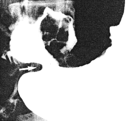 | Fig. 34.1. Case G.C. Irregularities of lesser and greater curvatures extending to commencement of pyloric sphincteric cylinder. Cylinder partially contracted (arrows). Pyloric aperture patent |