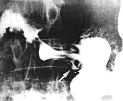 | Fig. 36.1 A,B. Case W.V.W. A Round, sessile, benign polyp (arrowed) in centre of pyloric sphincteric cylinder. B Near maximal contraction of sphincteric cylinder. The polyp (arrowed) has moved in an orad direction |