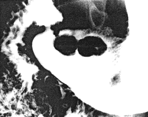 The 2 cases described here had sessile polyps on the mucosa of the sphincteric cylinder. During contraction of the latter the polyps moved in an orad direction, and with maximal contraction were clearly situated farther from the pyloric aperture than in the partially contracted or non-contracted phases. This seems to confirm the fact that the pyloric mucosa may move in an orad direction during contraction of the sphincteric cylinder, a phenomenon first described by Golden (l937) (Chap 13).