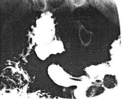 Case 36.1. W.V.W., 46 year old male, presented with vague upper abdominal symptoms. Cholecystectomy had been done 3 years previously. Radiographic examination showed a round, polyp-like lesion 1.5cm in diameter and surrounded by a circular mucosal fold, in the centre of the pyloric sphincteric cylinder (Fig 36.1A). Cyclical contractions of the cylinder were normal; during contraction the polyp moved in an orad direction, and with maximal contraction it was located approximately 2.0cm more orally (Fig 36.1B). Gastroscopy confirmed the presence of a benign, sessile polyp; histologically the mucosa was normal. At gastrostomy the polyp could not be located. Follow-up radiography and gastroscopy 3 years later showed it to be unchanged.