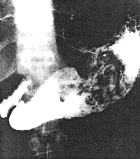 Zitomer et al. (l968) found that gastric neuropathy typically occurred in patients with a long history of inadequately controlled, moderately severe diabetes mellitus. The symptoms were generally mild and nonspecific, vomiting of undigested food from the previous day being one of the main manifestations. Radiologically the most constant and striking finding, occurring in 34 of their 35 cases, was sluggish, ineffectual and irregularly occurring peristalsis; on occasion peristalsis was absent altogether. There appeared to be decreased or absent propulsive motor activity, associated with abnormal gastric retention of food residues and barium, resembling a bezoar. The malfunction of gastric emptying and consequent unpredictable food absorption probably contributed to poor diabetic control. Despite the considerable delay in gastric emptying, barium could invariably be expressed by palpation through the pylorus, which remained patulous. If the patient was placed on his right side, passive gravitational emptying of liquid contents occurred, while solids tended to be retained. Overall the incidence of clinically significant gastric neuropathy was extremely low in diabetes mellitus, a figure of less than one per cent being mentioned.