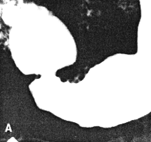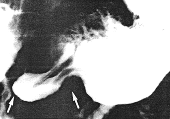 | Fig. 37.4. Case M.J. Permanent contraction of pyloric sphincteric cylinder (arrows) |