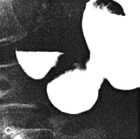 Attempts at controlling the diabetes in a peripheral hospital were only partially successful. She was readmitted 14 months later in a disorientated state with uncontrolled diabetes mellitus, diffuse abdominal pain and diarrhoea. Abdominal sonography was normal. Upper gastrointestinal radiological examination after an overnight fast showed numerous food residues in the stomach. Gastric peristalsis was decreased as before. The pyloric sphincteric cylinder remained partially contracted with absent cyclical activity, and contained food residues and unidentified tablets which she had found in the ward and swallowed the previous day (Fig. 37.2). (Each tablet measured 1.1 cm in diameter on the films; owing to magnification the true diameter would be in the region of 8.0 to 9.0 mm). The pyloric aperture remained patulous and no obstructing lesion was seen. The condition was diagnosed as diabetic gastroparesis.