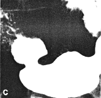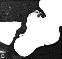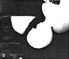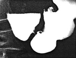 | Fig. 37.1. C-F. Case D.R. After treatment and clinical improvement. Lessened contraction of sphincteric cylinder. Some movement evident but normal cyclical activity absent. Note pancreatic calcification | |