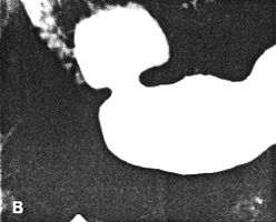 | Fig. 37.1. A,B. Case D.R. A Food residues in stomach. Pyloric aperture patent. Gastric peristaltic activity diminished. B Pyloric sphincteric cylinder (arrows) contracted most of the time. |