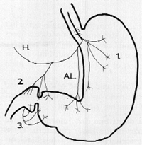 | Fig. 8.1. Diagram of gastric branches of anterior vagus. 1., Direct branches; 2., branches emanating from vagal supply to liver (superior pyloric nerves); 3., branches emanating from vagal supply to liver (inferior pyloric nerves); H., hepatic branch or branches; A.L., anterior nerve of Latarjet (principal anterior nerve of lesser curvature) |